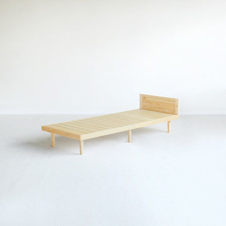 - 通気性に優れたすのこを使った、快適なひのきのベッド。自然の心地よさを取り入れられる無垢材でありながら、見た目は軽やかさを感じる「F=Float」シリーズ。丸脚とスリムな横顔が印象的で、ふわりと浮いているようなデザインです。枕が落ちにくい、ヘッドパネルがついたスタンダードタイプのセミシングルベッド。