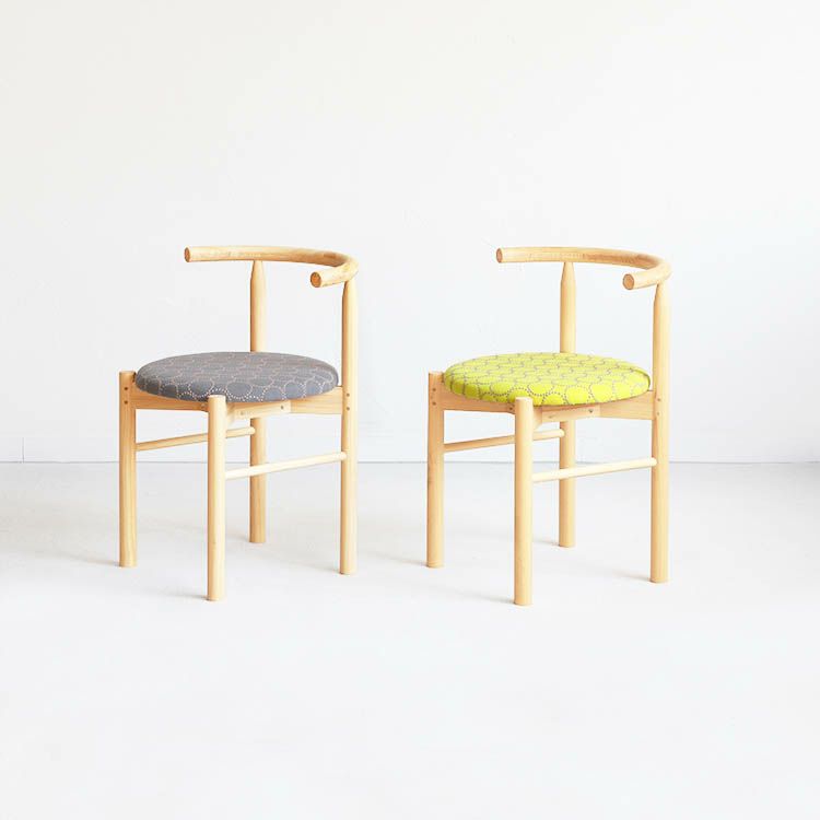優美な曲線を描く背もたれが目を引く、無垢材のチェアとしては珍しいフォルムのチェア。ひのきのしなやかさを利用した、背もたれの弾力性が体にフィットする座り心地。ミナペルホネンのテキスタイルのドットと、チェアの丸いフォルムが掛け合わさり、主役級の存在感を放ちます。