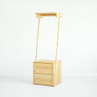 - お部屋のスペースを有効に使えるワードローブ。引き出しが2杯と、ショート丈の上着を掛けられるハンガーを組み合わせた収納。合板を使わず国産杉材を贅沢に使った引き出しは、タオルやアンダーウェアなど布ものを収納すると木の香りに包まれます。棚上にものを置いたり、付属のサイドフックで掛ける収納もでき、省スペースを賢く活用したい方におすすめです。