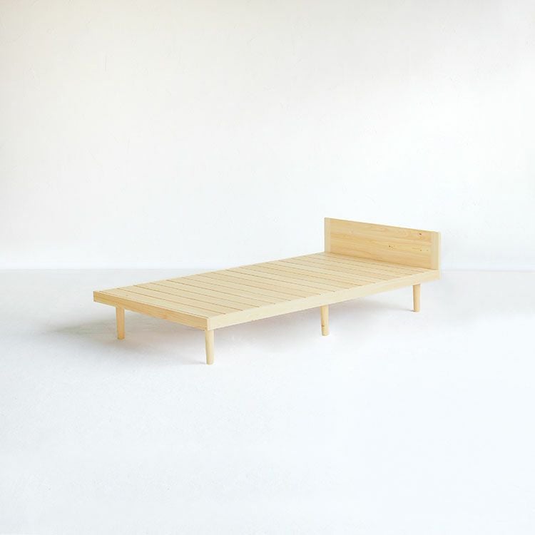 - 通気性に優れたすのこを使った、快適なひのきのベッド。自然の心地よさを取り入れられる無垢材でありながら、見た目は軽やかさを感じる「F=Float」シリーズ。丸脚とスリムな横顔が印象的で、ふわりと浮いているようなデザインです。枕が落ちにくい、ヘッドパネルがついたスタンダードタイプのシングルベッド。