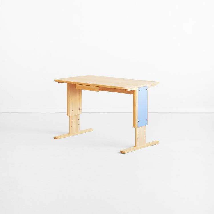 - 創業当初から20年来選ばれ続けてきた定番商品の、高さ調節機能付き学習机をリニューアル。新モデルは小学校で採用されている新JIS規格に適合。子どもの成長に合わせた学習環境づくりをしっかりサポートします。ドロワーの位置は3箇所どこでも設置できる機能性をプラスした、学習机の新しいスタンダード。側面のパネルはひのきの「plain」とイタリアンレザーの「pale blue」をご用意。定番サイズの幅100cm。
