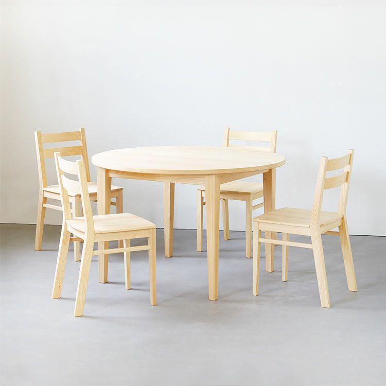 - 4人用にちょうど良い110cmサイズの「ラウンドテーブル D hinoki 110」と、ダイニングチェア用につくられた「Dチェア」4脚を合わせた、家具5点セット。人気の高いラウンドテーブルを、家族の暮らしにぴったりな内容のセットでご用意しました。