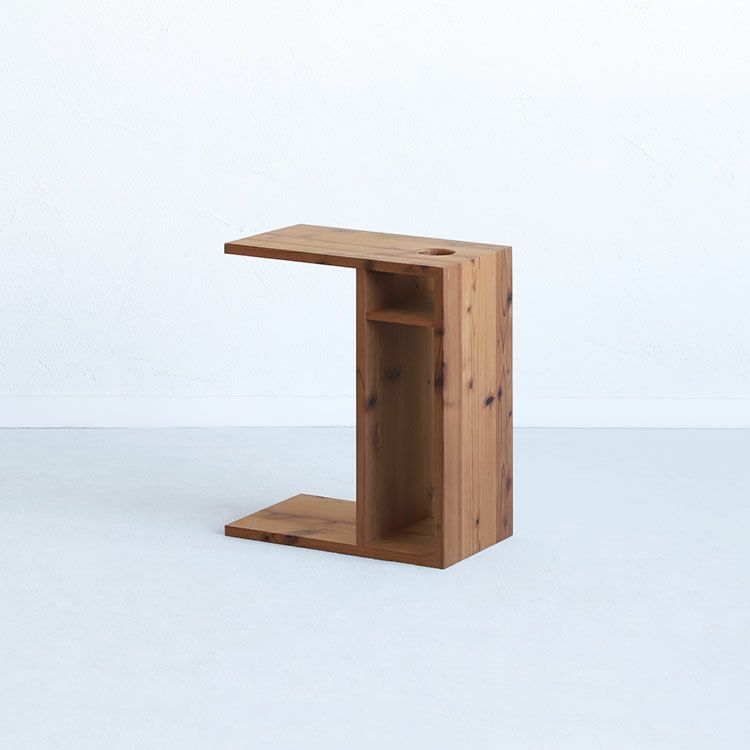 対照的な色味を、あえてアシンメトリーに組み合わせた通常品「サイドテーブル A」。透明感のある白木の針葉樹と、こっくり深みのある広葉樹。それぞれの表情を楽しみながら使える一台です。