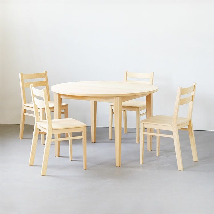 - 4人用にちょうど良い110cmサイズの「ラウンドテーブル D hinoki 110」と、ダイニングチェア用につくられた「Dチェア」4脚を合わせた、家具5点セット。人気の高いラウンドテーブルを、家族の暮らしにぴったりな内容のセットでご用意しました。