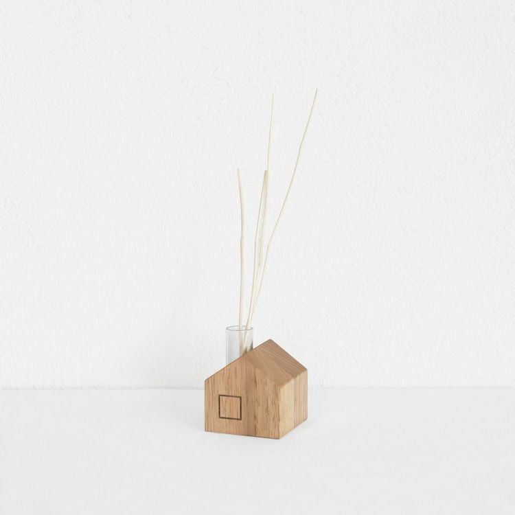 素材はキシルの家具と同じ、無垢100%。一般的な木製家具は、表面に薄いシートを貼った状態を「無垢の家具」と呼ぶこともありますが、キシルの場合は表面だけでなく中身も純度100%の無垢材を使用し、木が本来もっている力を最大限に引き出します。おうちの形をしたディフューザーは、素材見本としてもぜひお使いください。