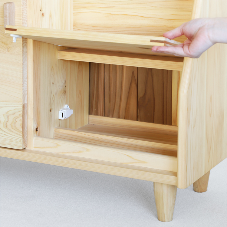 扉の取っ手は、国産の楓(紅葉の木)をつかった贅沢なつくり。細部にはラウンド加工を施しているので柔らかな印象に。からくりトビラは桜材のかんざし加工がほんのりとアクセントに。