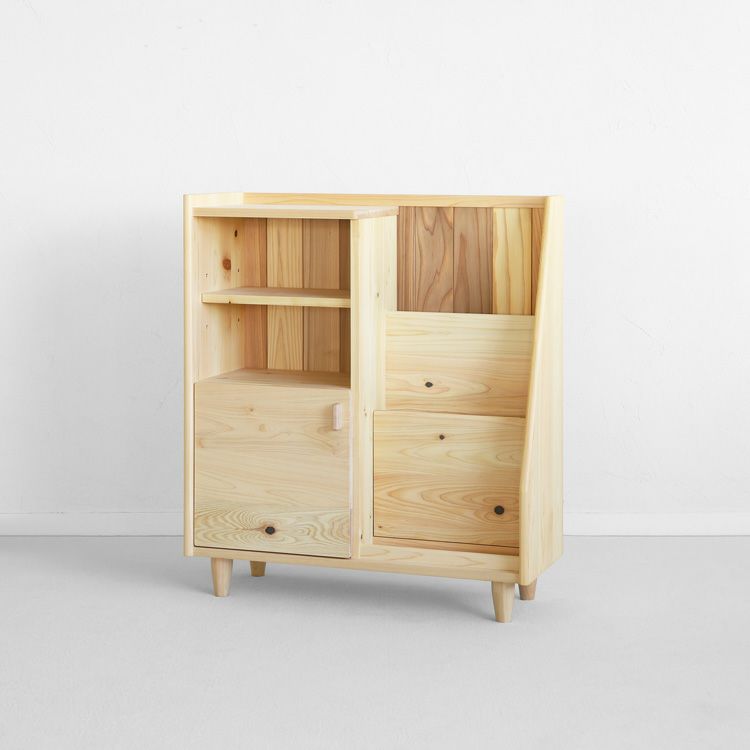 見せるマガジンラックと隠すキャビネット、異なる構造の2つの家具を一体化させた収納スタイル。棚板は取り外しができるので、収納したいものに合わせて柔軟に対応可。生活感を抑えながら、ディスプレイも楽しめる、いいとこ取りの収納アイテム。