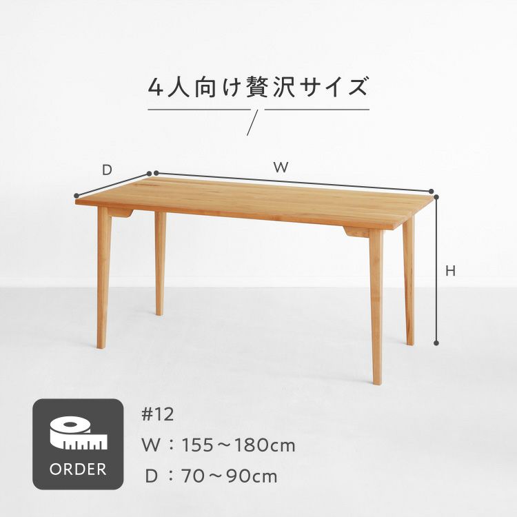 - ご家族の人数やお部屋の大きさに合わせ、自由にカスタマイズができるオーダーテーブルサービス。天板から脚部まで国産のくるみ材を使ったデザインです。1人用のミニテーブルから、オフィスの会議用テーブルまで、幅広いサイズ対応が可能です。