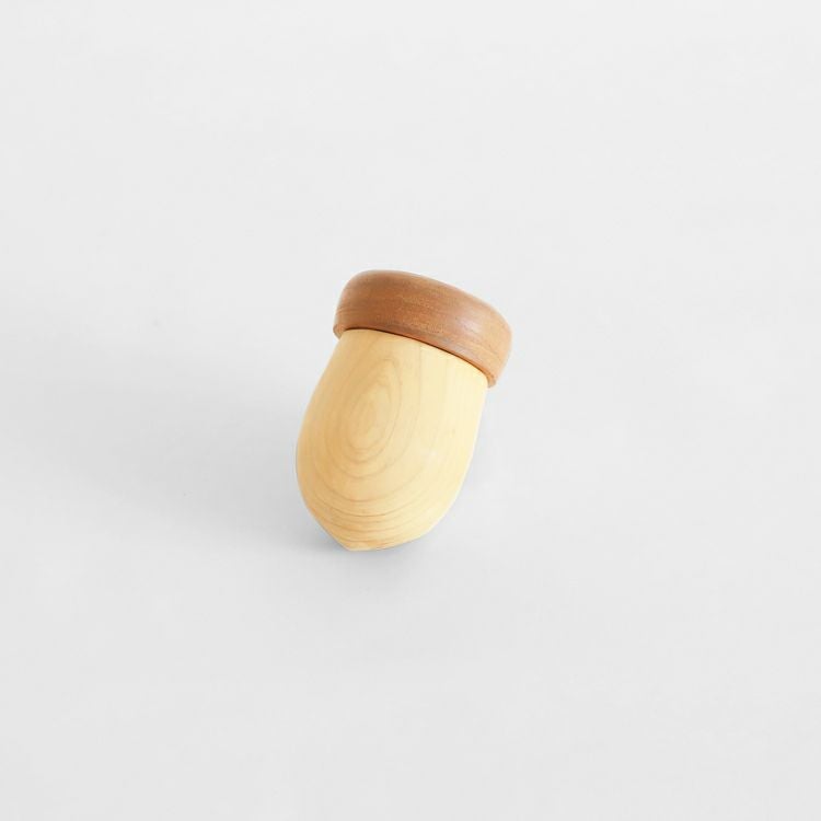 胡桃材のこげ茶色&ブナ材のやわらかな色合いで、かわいいどんぐりを表現。手のひらで包み込むと、優しい木のぬくもりを感じることができます。使うほどに手になじんで自然なツヤが出てくるのも楽しみですね。