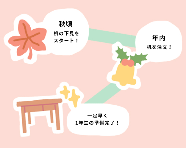 ほしい机が決まったら購入は年内がベスト。そして大掃除などのタイミングで設置してあげると、お子さまのやる気をキープしたまま新年&入学を迎えることができます。