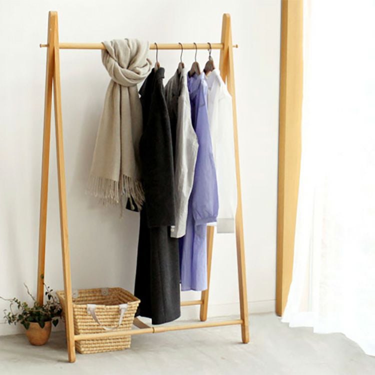 玄関やベッドの近くなどにさっと置けるハンガーラック。シンプルなデザインなので、お部屋になじみやすいスタイルです。フレーム部分にヒノキ、ポール部分にはブナ材を使ったハンガーラックです。やさしい木の風合いはインテリアにしっくりなじみます。